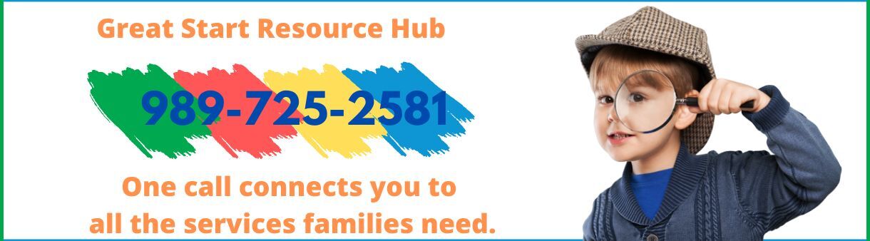 Boy with magnifying glass looks at Great Start Resource Hub phone number 989-725-2581